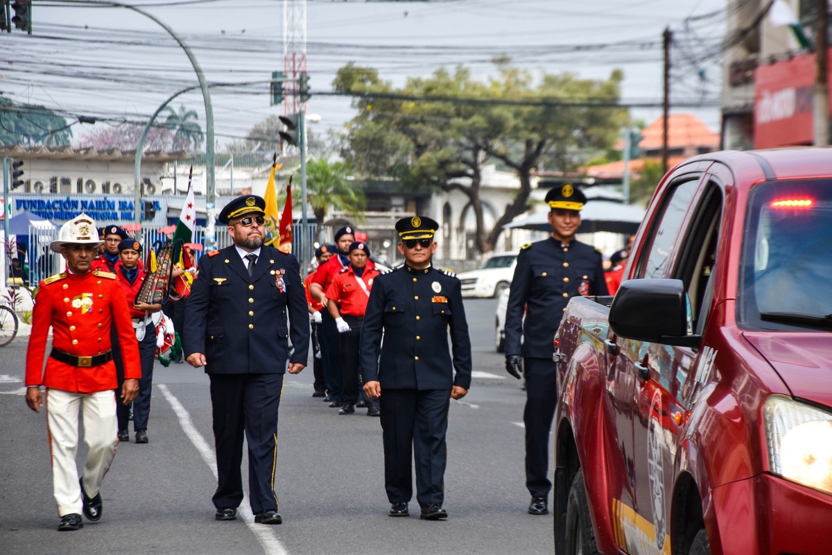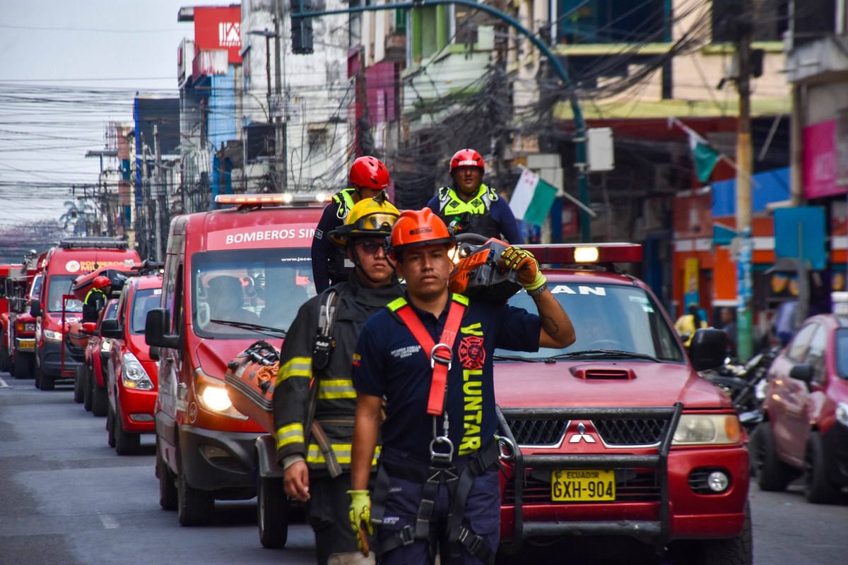 El Comandante Ing. Alexander Ramos Rodríguez jefe del Cuerpo de Bomberos Bucay, junto al TCrnl. (B) Ing. Juan Pablo Raffo, jefe del Cuerpo de Bomberos Milagro y líder del Circuito 1, desfilan en un evento que tuvo como objetivo rendir homenaje a los hombres y mujeres que, con valor y entrega, sirven a la comunidad protegiendo vidas y bienes ante toda emergencia.